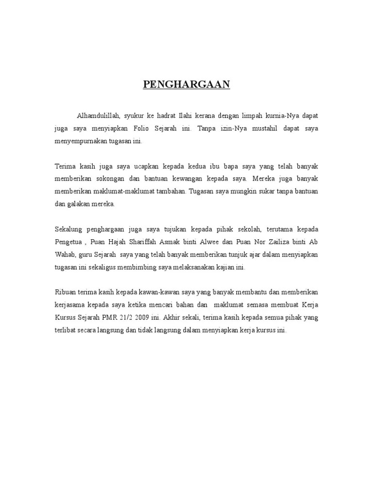 Text of penghargaan folio sejarah. Kerja kursus sejarah sebagai sebahagian daripada syarat peperiksaan penilaian menengah rendah (pmr) 2013. Penghargaan saya amir hasif bin zulkifli, dari kelas 3 amanah berasa amat bersyukur kepada allah. 我是做folio sejarah ,我要bapa saya, emak saya dan kakak saya 的范文,以及penghargaan dan rumusan. Penghargaan melalui peluang keemasan ini, saya muhamad zaini bin.